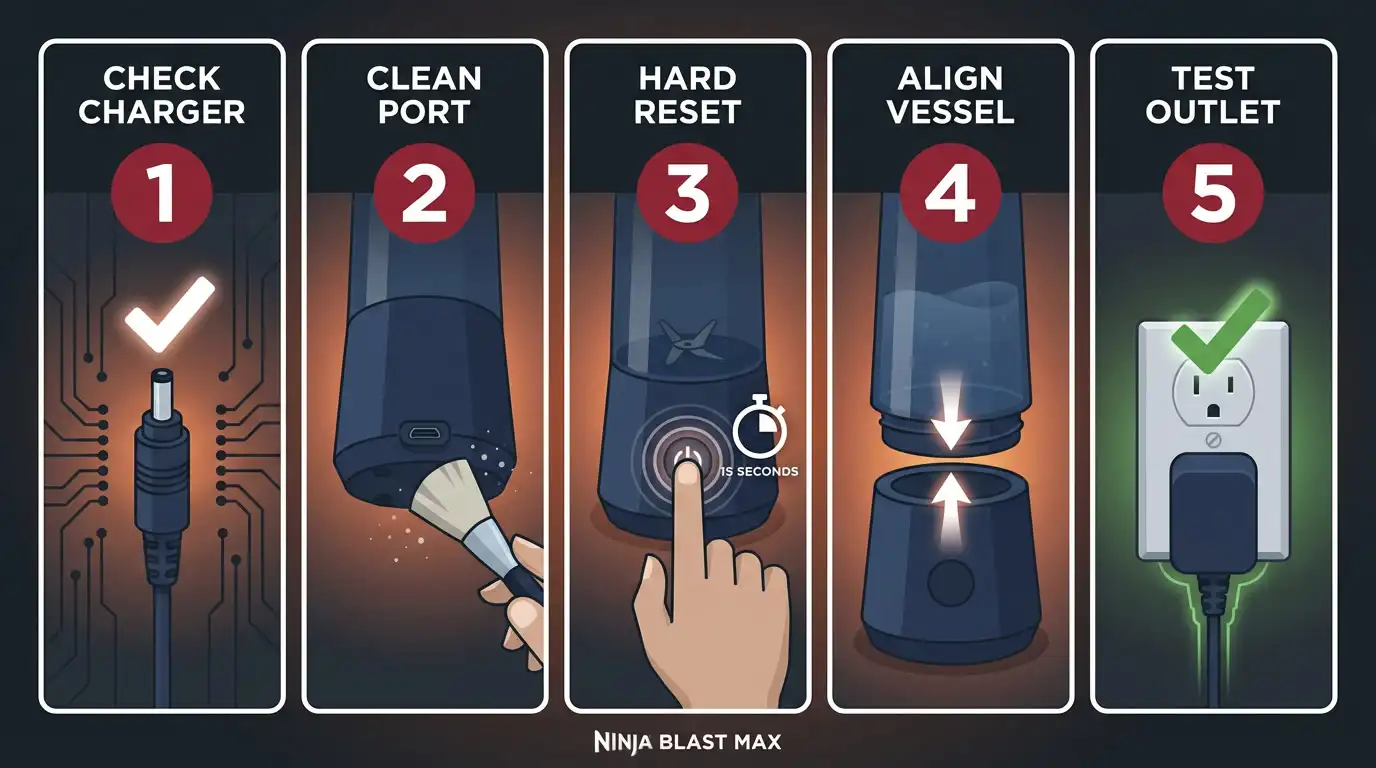 Most Ninja Blast Max charging failures are not hardware defects. They are caused by an incorrect charger, a misaligned vessel, or residual moisture in the proprietary DC port, and almost all are fixable in under ten minutes.